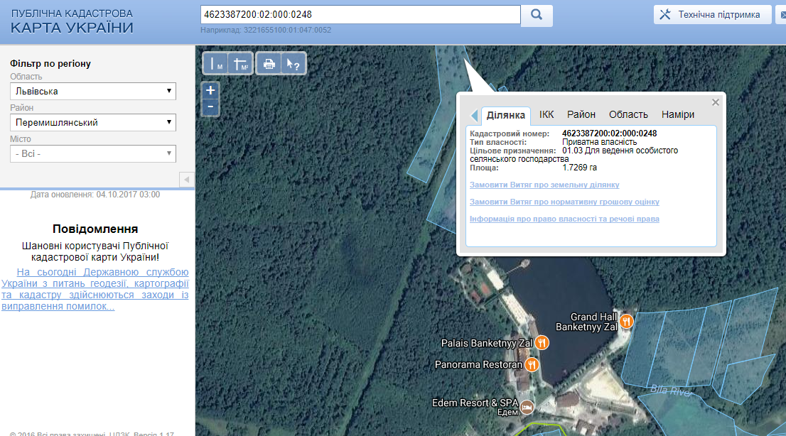Окремі види електронних послуг, наприклад, замовлення Витягу з Державного земельного кадастру про земельну ділянку, Витягу про нормативну грошову оцінку або Інформації про право власності та речові права можливо замовити безпосередньо з Публічної кадастрової карти.